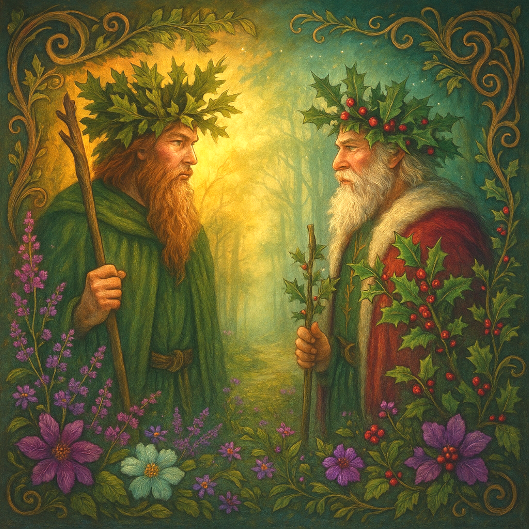 Among the old tales, the Oak King and Holly King battled over the seasons. The Oak King, representing light, was reborn at Yule, while the Holly King, guardian of shadow, began his retreat. Their eternal exchange revealed an ancient rhythm of death and renewal that a large part of humanity would later retell in the story of Christ’s birth, his death, and resurrection.